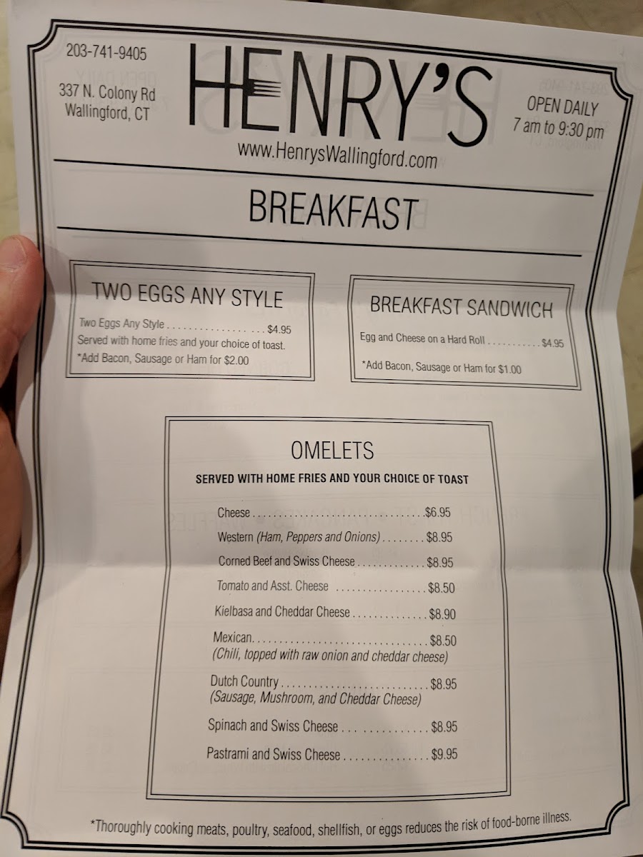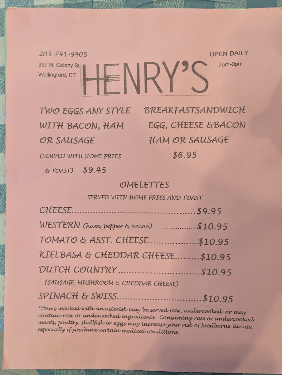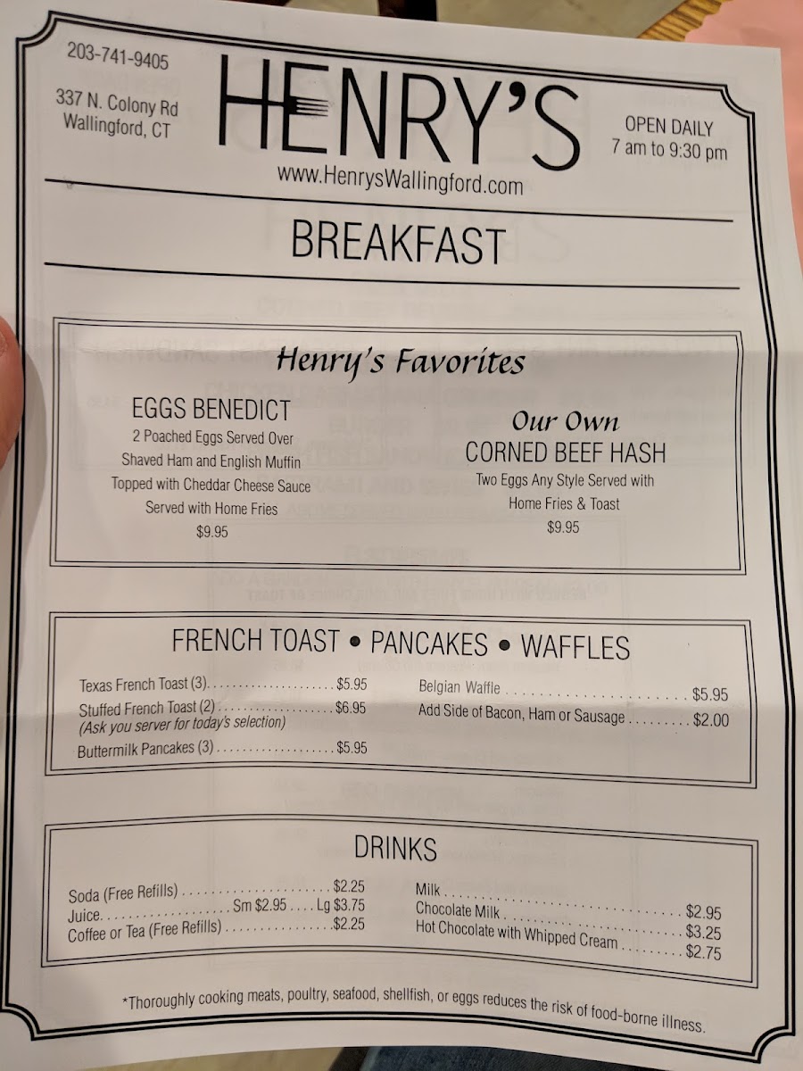Henry’s offers a straightforward and inviting menu typical of a classic American breakfast spot. The selection focuses on comforting morning and brunch favorites, ideal for starting your day with familiar, hearty dishes in a relaxed setting.